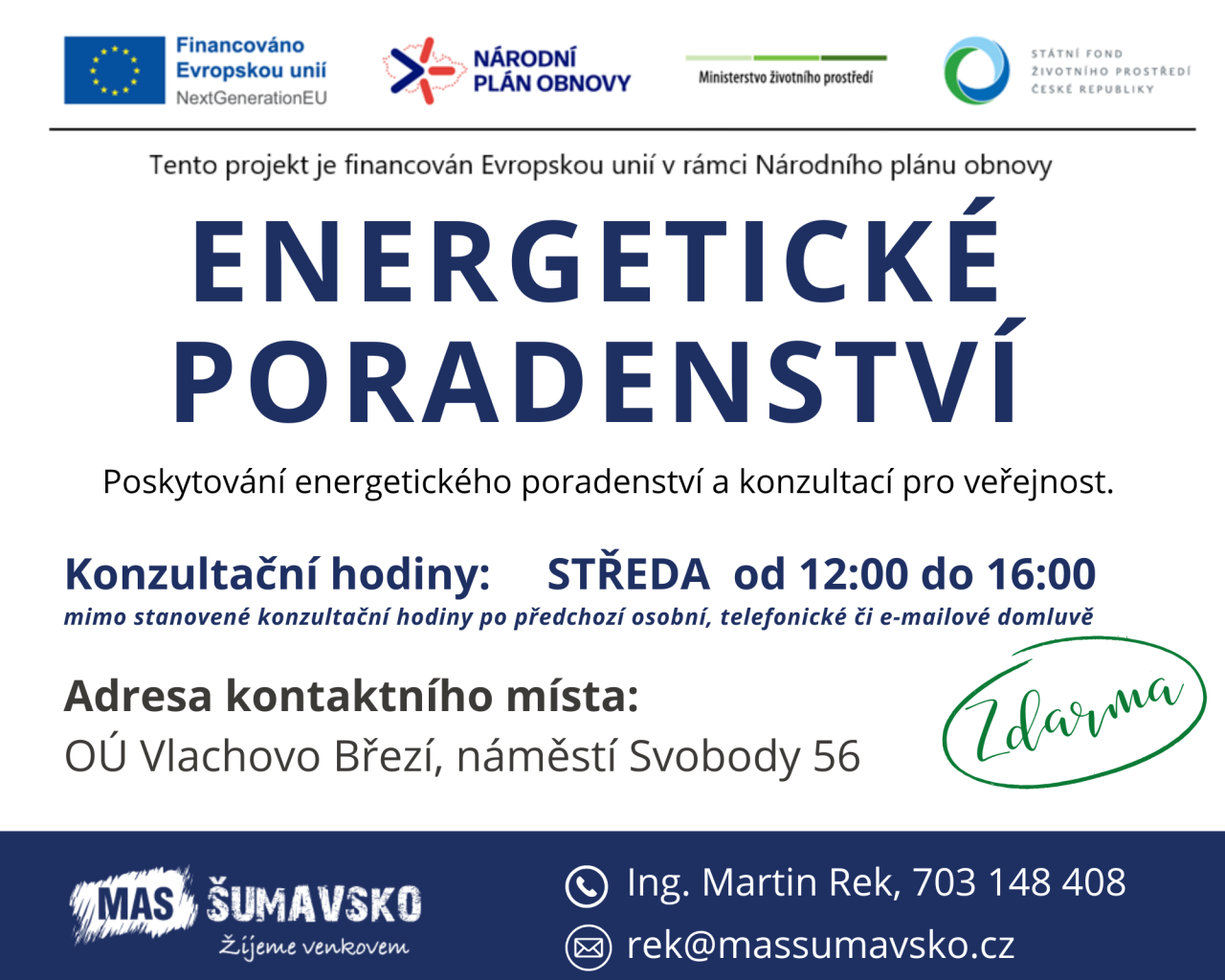 Poskytování energetického poradenství a konzultací pro veřejnost - osobně Ve Vlachově Březí každou středu od 12:00 do 16:00 hod., mimo stanovené konzultační hodiny po předchozí osobní/telefonické/e-mailové domluvě.